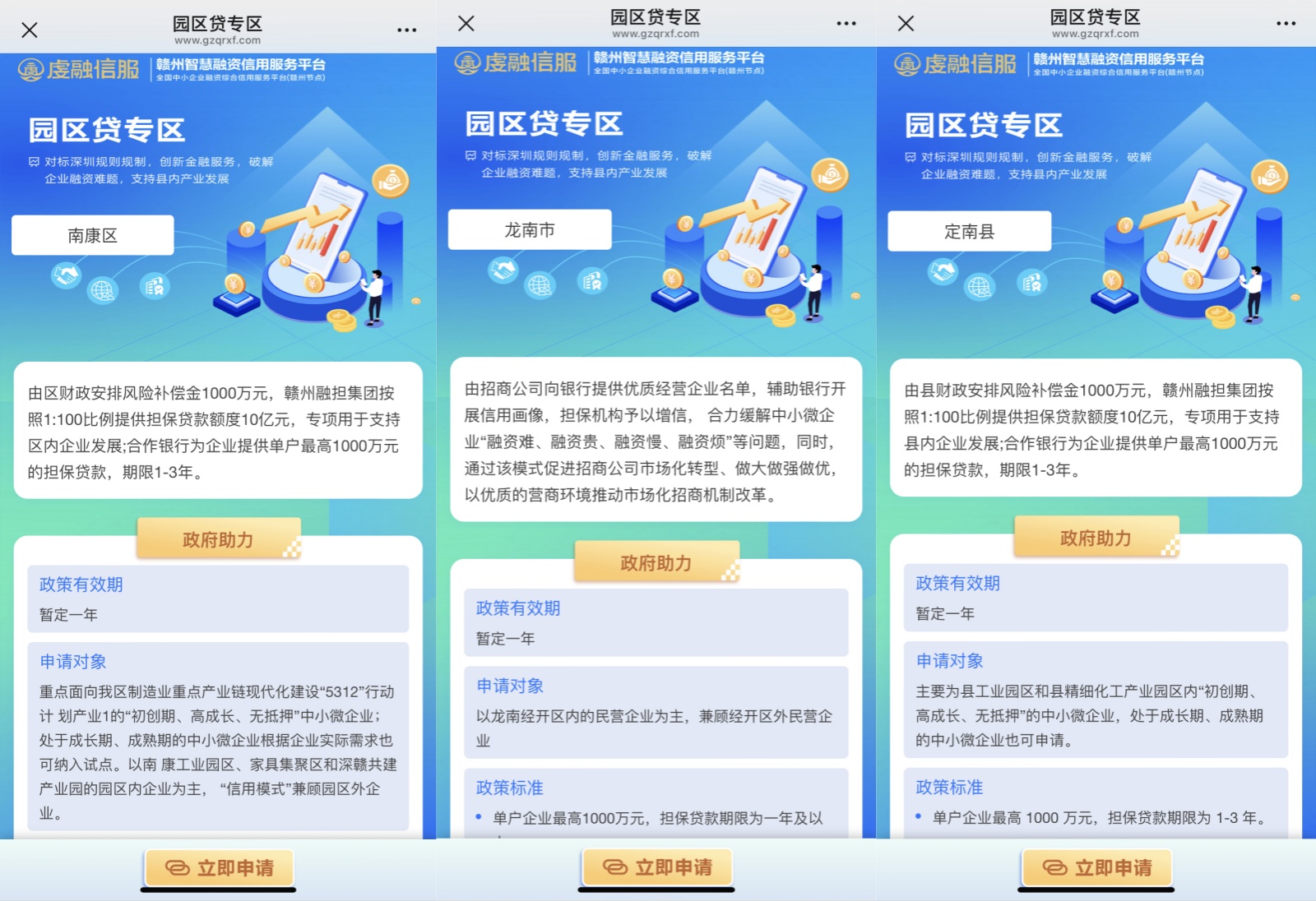 “園區(qū)貸”是破解企業(yè)融資瓶頸,助力惠企政策落地的重要成果,“虔融信服”平臺為助力緩解中小微企業(yè)“融資難、融資貴、融資慢、融資煩”等難題實(shí)行了以下重要舉措:(1)創(chuàng)新設(shè)計(jì)“政府提供白名單—銀行審核放款—擔(dān)保公司批量擔(dān)?!钡娜鞒叹€上化業(yè)務(wù)模式。將傳統(tǒng)擔(dān)保業(yè)務(wù)流程全線上化,實(shí)現(xiàn)了全過程留痕、可視化監(jiān)管、可回溯管理,助力提升政府政策運(yùn)用水平,提高銀行、擔(dān)保公司審批效率,降低企業(yè)融資成本。(2)打通園區(qū)企業(yè)經(jīng)營數(shù)據(jù)與政務(wù)數(shù)據(jù)壁壘,開放涉企信用信息查詢功能。平臺實(shí)現(xiàn)了市監(jiān)、稅務(wù)、社保等多源數(shù)據(jù)整合互通;為園區(qū)開發(fā)運(yùn)營公司線上提供和更新企業(yè)在園經(jīng)營相關(guān)數(shù)據(jù)提供便利,向試點(diǎn)銀行、擔(dān)保機(jī)構(gòu)等開放涉企信用信息查詢功能。(3)開發(fā)增設(shè)“園區(qū)貸”專區(qū)申請入口。平臺已實(shí)現(xiàn)九個(gè)縣(市、區(qū))“園區(qū)貸”全覆蓋,目前已上線安遠(yuǎn)縣、贛州經(jīng)開區(qū)、南康區(qū)、龍南市、定南縣共五個(gè)區(qū)縣“園區(qū)貸”專區(qū),有效實(shí)現(xiàn)企業(yè)“一鍵申請”和銀行線上收集融資需求、線下快速精準(zhǔn)對接功能。截至2025年6月底,虔融信服“園區(qū)貸”專區(qū)已收到33筆共計(jì)15550萬元融資需求,銀行已授信10筆,金額達(dá)4310萬元。
