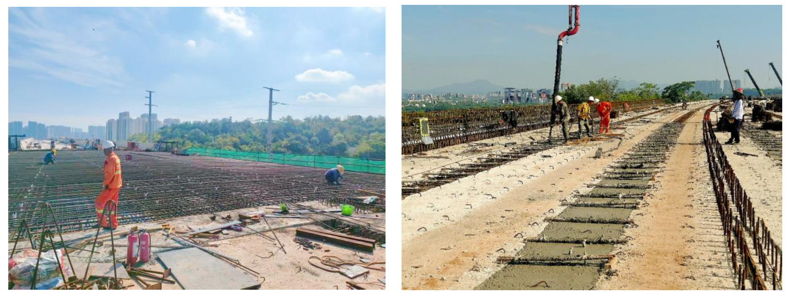 武陵大道快速路(含地下綜合管廊)工程-二標(biāo)段西起杜鵑花路,東接?xùn)|江源大道快速路,全長約4.76公里。目前,項(xiàng)目累計(jì)完成總工程量的88.37%,標(biāo)頭至十三中段(含立交)段高架已正式通車,地面輔道已具備通車條件;隧道至黃金大橋段高架主體結(jié)構(gòu)已完成約96%。