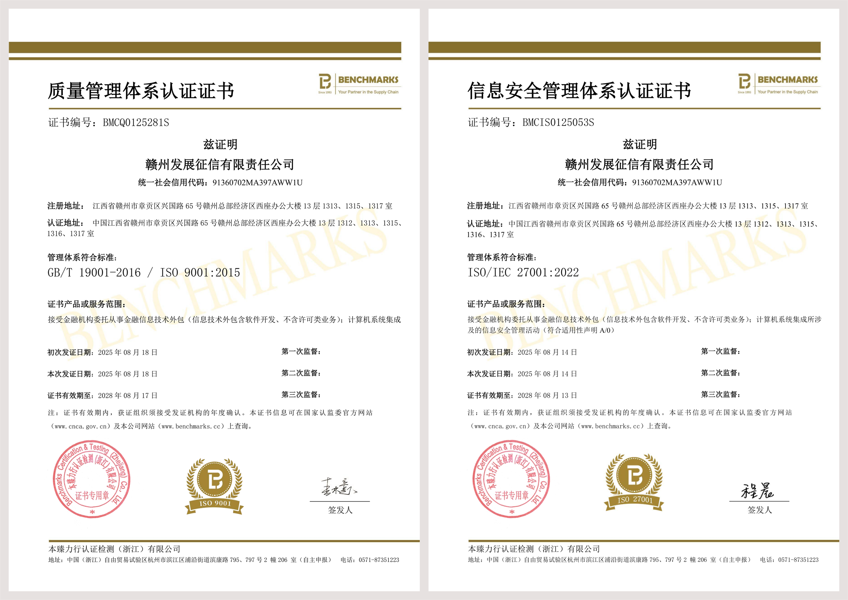 贛州發(fā)展征信公司榮獲ISO9001與ISO27001雙體系認(rèn)證