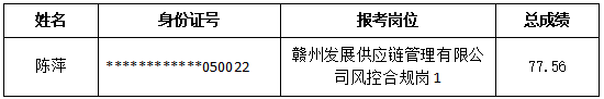 根據(jù)《贛州發(fā)展投資控股集團(tuán)有限責(zé)任公司2025年公開招聘公告》相關(guān)規(guī)定,因贛州發(fā)展供應(yīng)鏈管理有限公司風(fēng)控合規(guī)崗1江南個(gè)人自愿放棄體檢、背景調(diào)查資格,按總成績(jī)從高分到低分順延遞補(bǔ)?,F(xiàn)將遞補(bǔ)入圍體檢、背景調(diào)查人員名單及有關(guān)事項(xiàng)公告如下: