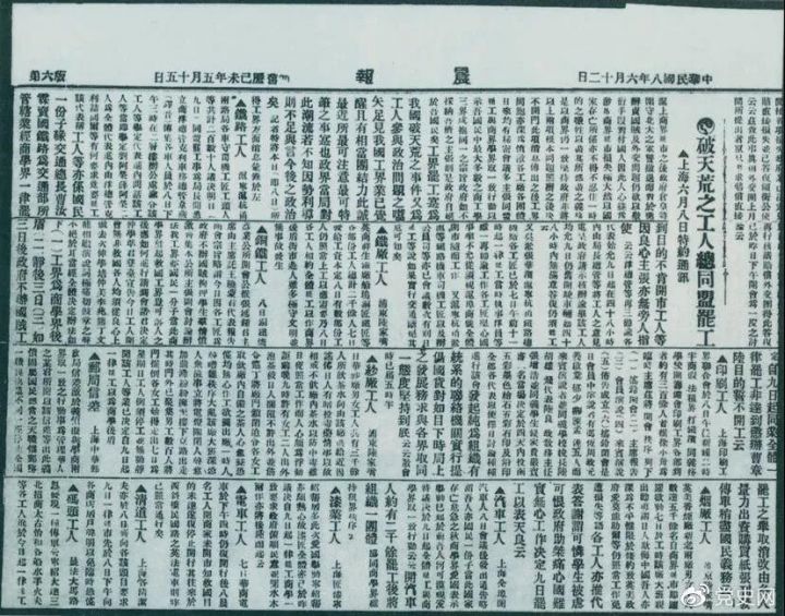 1919年6月3日以后,上海工人率先罷工,使五四愛國運動進入新的階段。圖為北京《晨報》關(guān)于上海六、七萬工人總同盟罷工的報道。