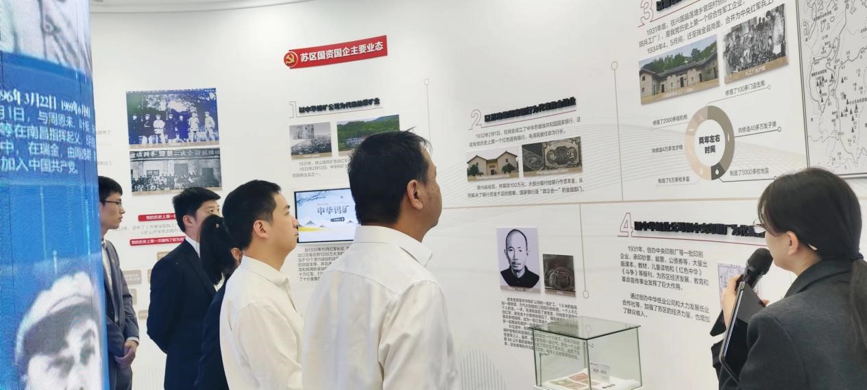 在國資國企黨建館,大家集中學(xué)習(xí)了習(xí)近平總書記關(guān)于國資國企改革發(fā)展和黨的建設(shè)重要論述,隨后在講解員引導(dǎo)下依次參觀了“牢記領(lǐng)袖囑托、傳承紅色基因”“追根溯源、不忘初心”“固本強基、黨建引領(lǐng)”“融合賦能、感恩奮進(jìn)”“建功新時代、開啟新征程”等五個篇章。通過圖文視頻、聲光電、幻影成像等形式多樣的現(xiàn)代化表現(xiàn)手法,讓全體參觀人員更直觀真切地感受了蘇區(qū)國資國企的光榮歷史,接受了一次深刻的黨性教育,進(jìn)一步堅定了理想信念。